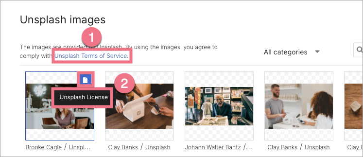 4. You will find a link to Unsplash Terms of Service (1) in the upper left corner of the gallery, and you can access the Unsplash License (2) of each image at any time.
