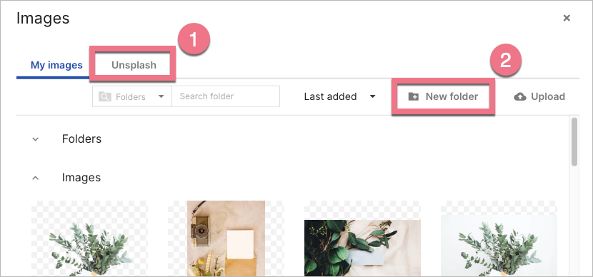2. You will find the Unsplash tab (1) on the left. You can create a new folder (2) to sort your images.