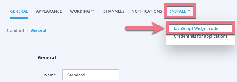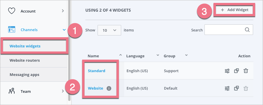 3. Go to Website widgets (1) and select your widget (2). If you do not have any widgets yet, add widget (3).