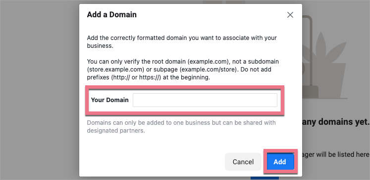 You can only verify ownership of the root domain. For example, if your landing page address is: https://www.mycompany.com/voucher, add only the root domain name in the appropriate field when adding a domain, here: mycompany.com.