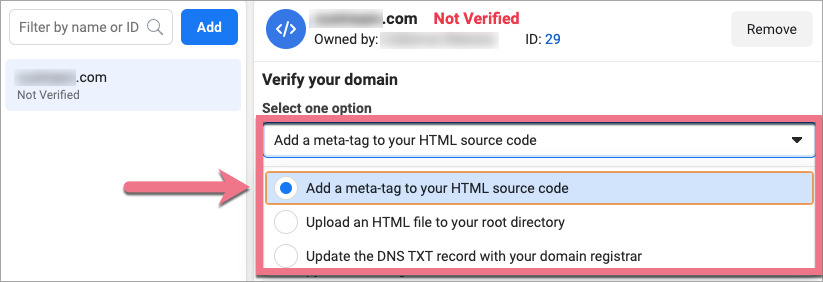 1. Select the verification option. Choose Add a meta-tag to your HTML source code.