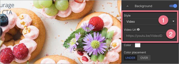 3. Then choose the background style – video (1). Paste the URL (2) of the clip.