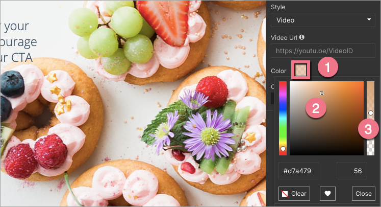 4. You can set a layer of color over or under the video background. Click on the color box (1) to choose a color (2) and adjust its transparency (3).