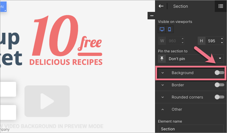 - If you are working on the template landing page and the background is not visible on individual sections, enter the Section settings and use the slider to turn off the background.
