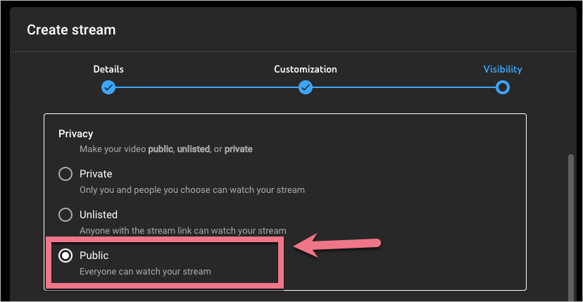 TIP: If you want the stream to be unlisted, create it, copy its link, and then change the address from https://www.youtube.com/live/11xx… to https://www.youtube.com/watch?v=11xx… Paste the changed address in the place indicated in point 5.