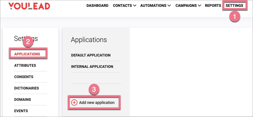 2. Go to Settings (1) > Applications (2) and select Add new application (3).