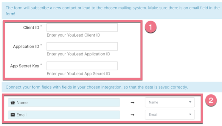 4. Paste the required data (1). Wait for the system to log in and then link the appropriate form fields to the values in YouLead (2).