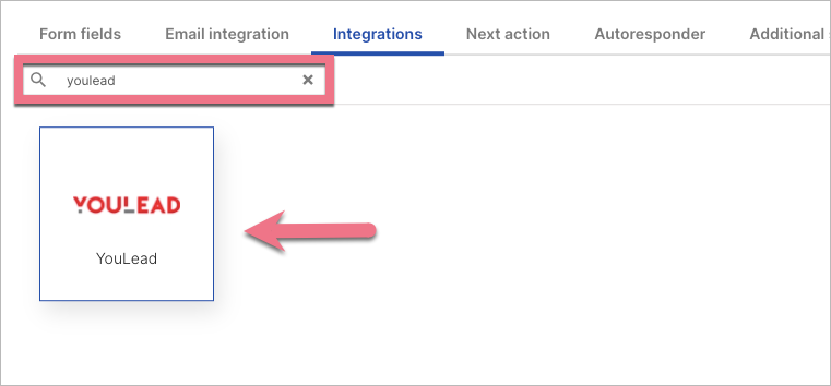 3. In the Integrations tab, choose YouLead. You can use the search bar to look for the integration. Type the name and press enter.