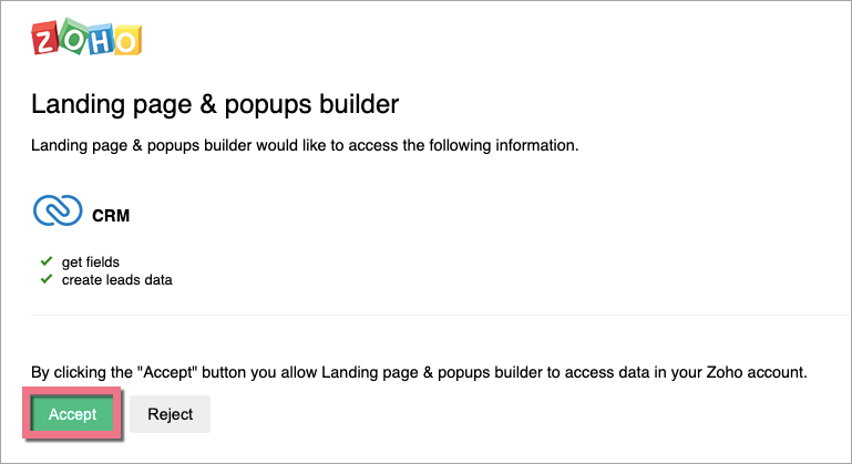 5. A message from the Zoho CRM will appear in a new browser window asking for permission to integrate your account with Landingi. Click Accept.