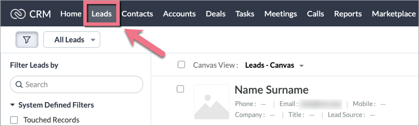 To see your leads in the Zoho CRM platform, click on the Leads tab.