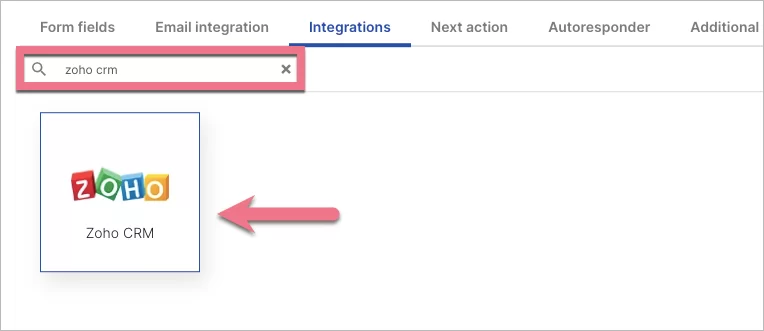 3. In the Integrations tab, choose Zoho CRM. You can use the search bar to look for the integration. Type the name and press enter.
