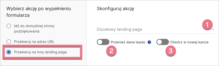 (2) Jeśli chcesz przesłać wszystkie dane leada z tego landing page’a na kolejny, zaznacz checkbox Przenieś dane leada.