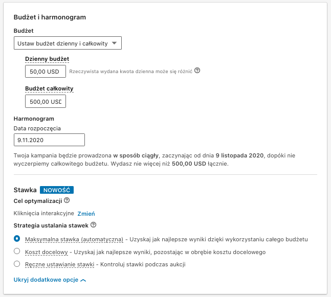 – maksymalną stawkę (cały budżet zostanie wykorzystany na daną pulę wyświetleń, algorytm LinkedIn będzie podejmować decyzje, jak ustawiać i dostosowywać dzienną stawkę,