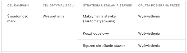 Po wyborze celu kampanii “świadomość marki” jedynym celem optymalizacji, do którego może dążyć nasza kampania, są wyświetlenia reklamy (chcemy, żeby wyświetlało się ich jak najwięcej).