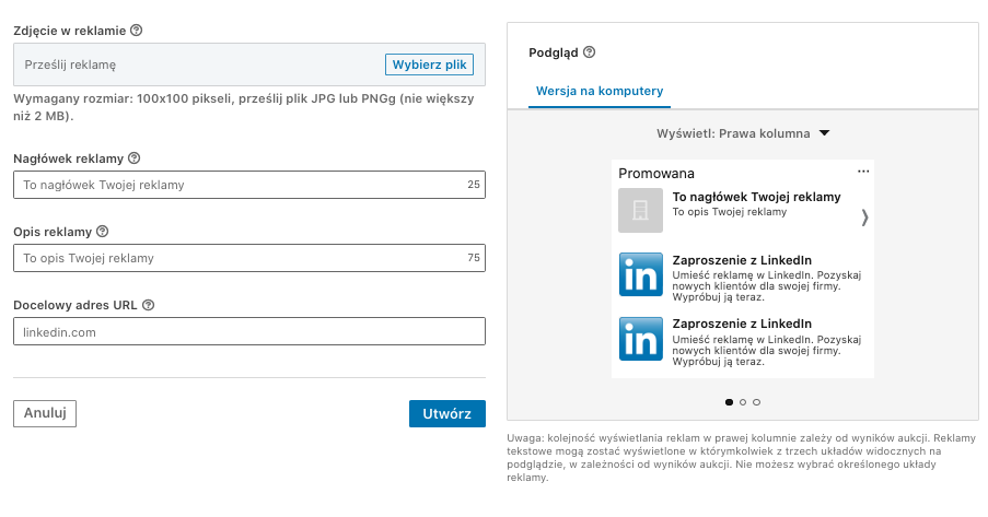 LinkedIn daje Ci 3 opcje wyświetlania reklam tekstowych – na tym przykładzie jest to wyświetlanie w prawej kolumnie. Ale możesz też wykorzystać pasek na górze strony z linkiem do kliknięcia.