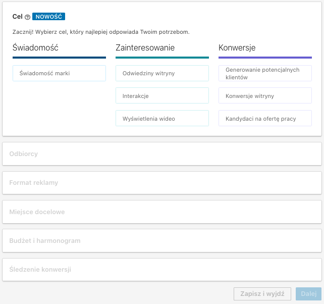 Od celu, jaki wybierzesz, zależy, jaką formę wyświetlania (lub wysyłania!) reklam zaproponuje LinkedIn.