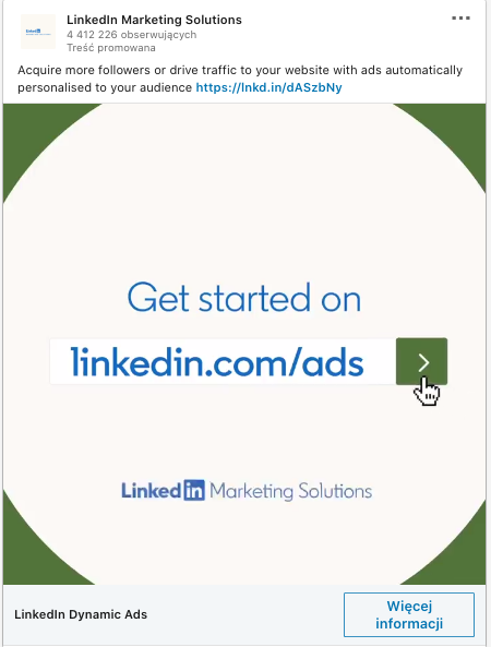 To typ reklamy, który jest uniwersalny i znajomy, bo podobny do postów sponsorowanych z innych portali społecznościowych (Facebook, Instagram). Wygląda jak udostępniony przez “zwykłego” użytkownika post, ale zbiera większe zasięgi i zawiera dodatkowe call to action (w tym przykładzie jest to przycisk “Więcej informacji” w prawym dolnym rogu).