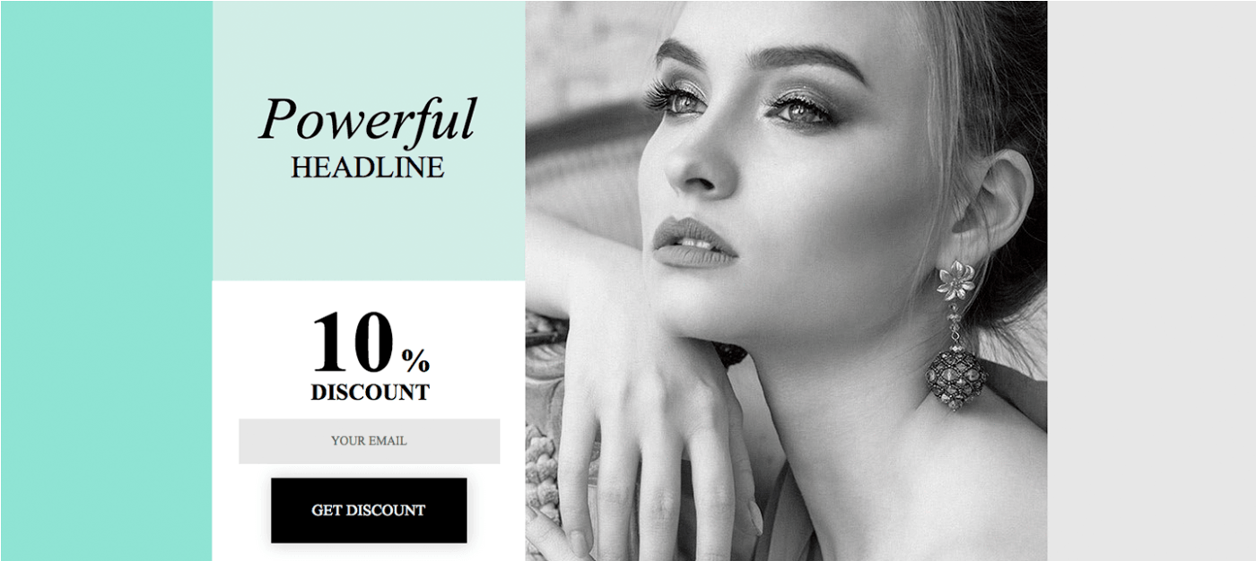 Plusem takiego rozwiązania jest możliwość stworzenia strony skoncentrowanej w stu procentach na celu, pozbawionej rozpraszaczy. Landing page prezentowany poniżej oferuje prostą wymianę: dziesięcioprocentową zniżkę w zamian za adres e-mail. Takie rozwiązanie jest najbardziej podstawowe, jednocześnie wciąż pozostając skutecznym.