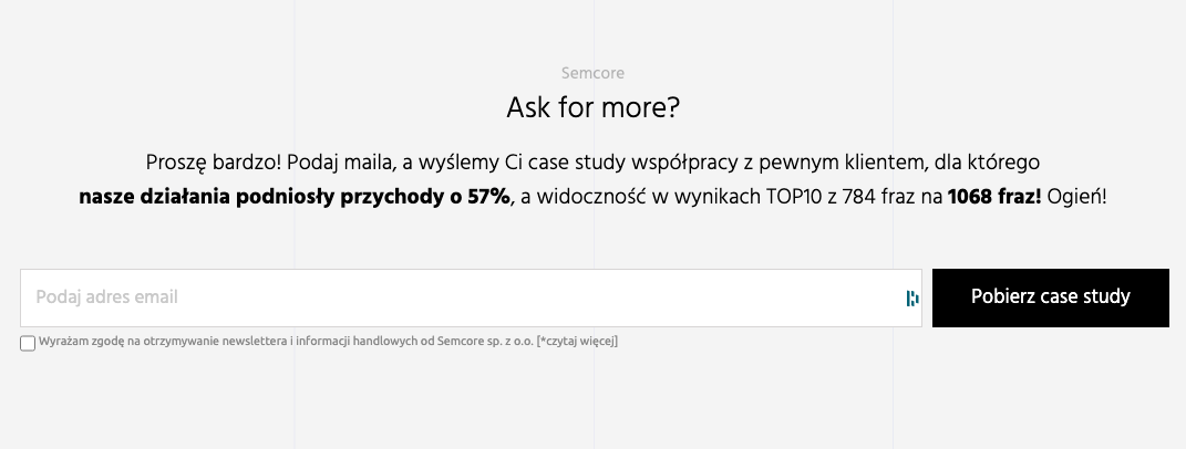 Aby użytkownik podzielił się z nami swoim adresem email, warto dać mu coś w zamian. Może to być np. kod rabatowy lub darmowy ebook za zostawienie swoich danych kontaktowych. Dzięki temu akcja, której oczekujemy od potencjalnego klienta, przynosi użytkownikowi namacalną (i darmową) korzyść, jest łatwa i nie wymaga od niego wielkiego wysiłku.