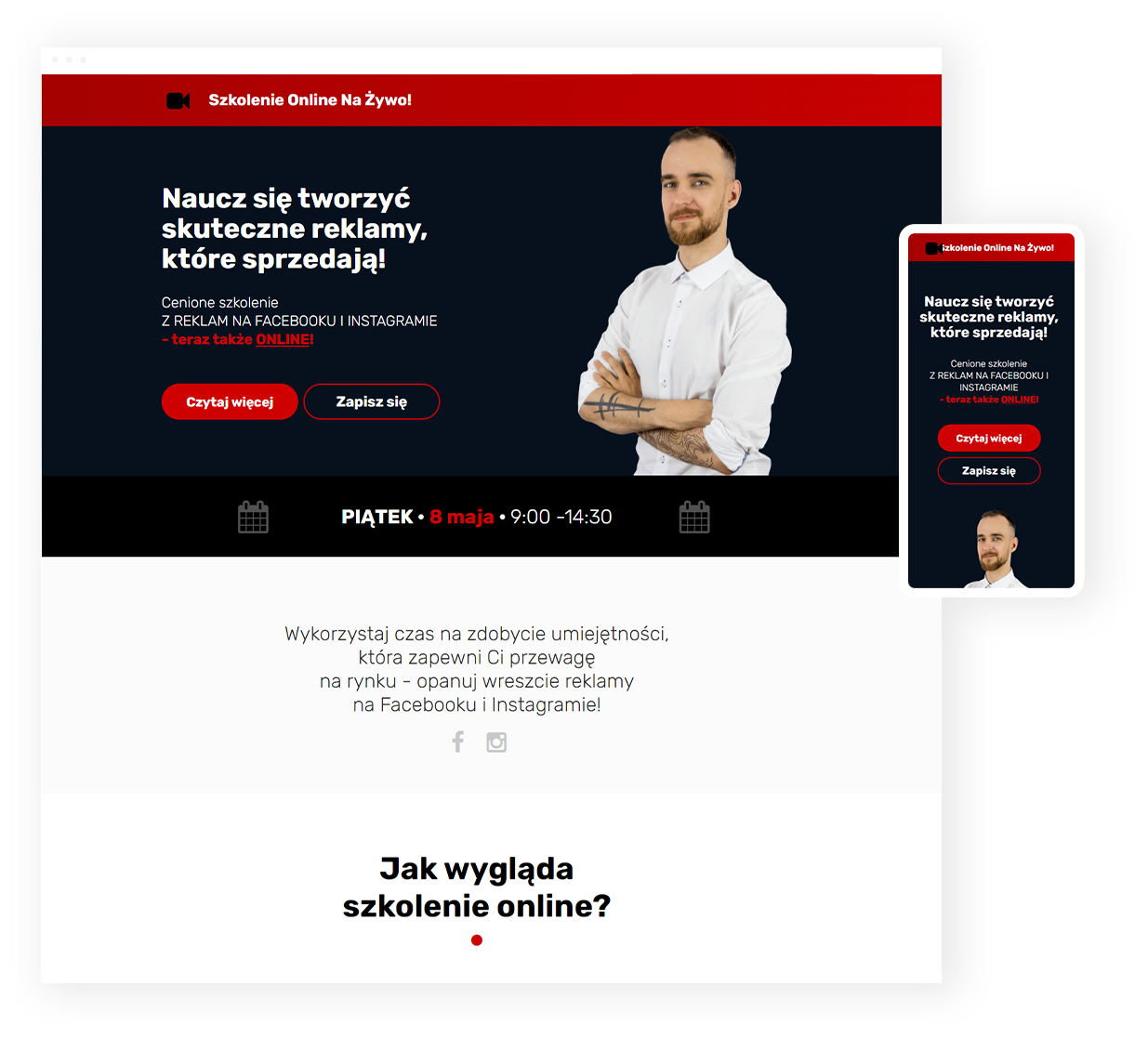 Wystarczy jedno spojrzenie, by wiedzieć, co oferuje kurs i jakie niesie ze sobą wartości. Czytelny CTA zachęca do zapisania się. Poniżej dowiadujemy się, kiedy odbywa się kurs, co dzięki niemu zyskamy, jak wygląda szkolenie online, jaki jest jego plan i co otrzymamy dodatkowo. Landing page jest nieskomplikowany, wręcz minimalistyczny, a dzięki temu przejrzysty.