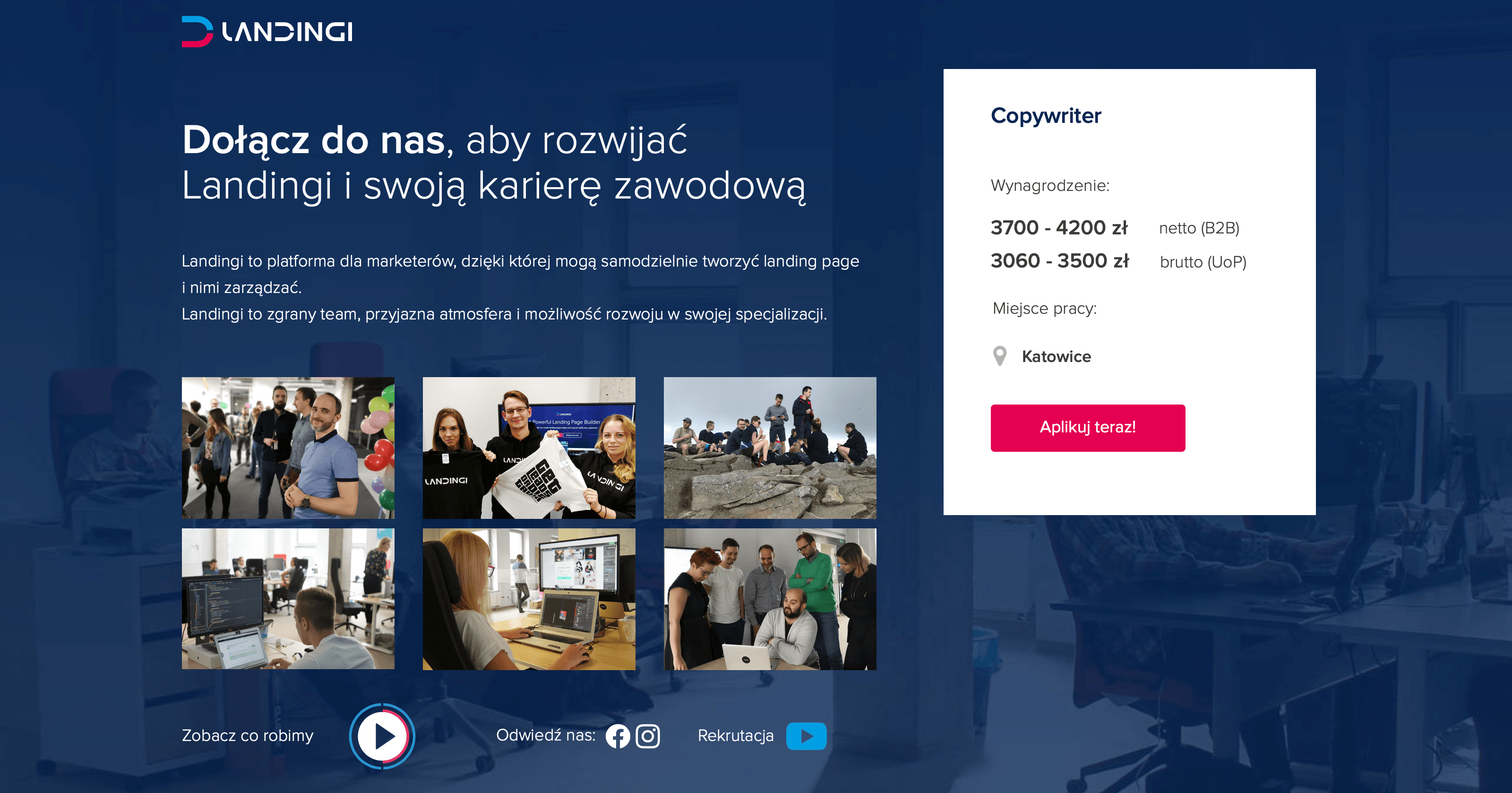 Zadbaj o stronę wizualną LP, wskazując korzyści i informacje istotne z punktu widzenia kandydata, a proces aplikowania powinien być możliwie jak najprostszy.