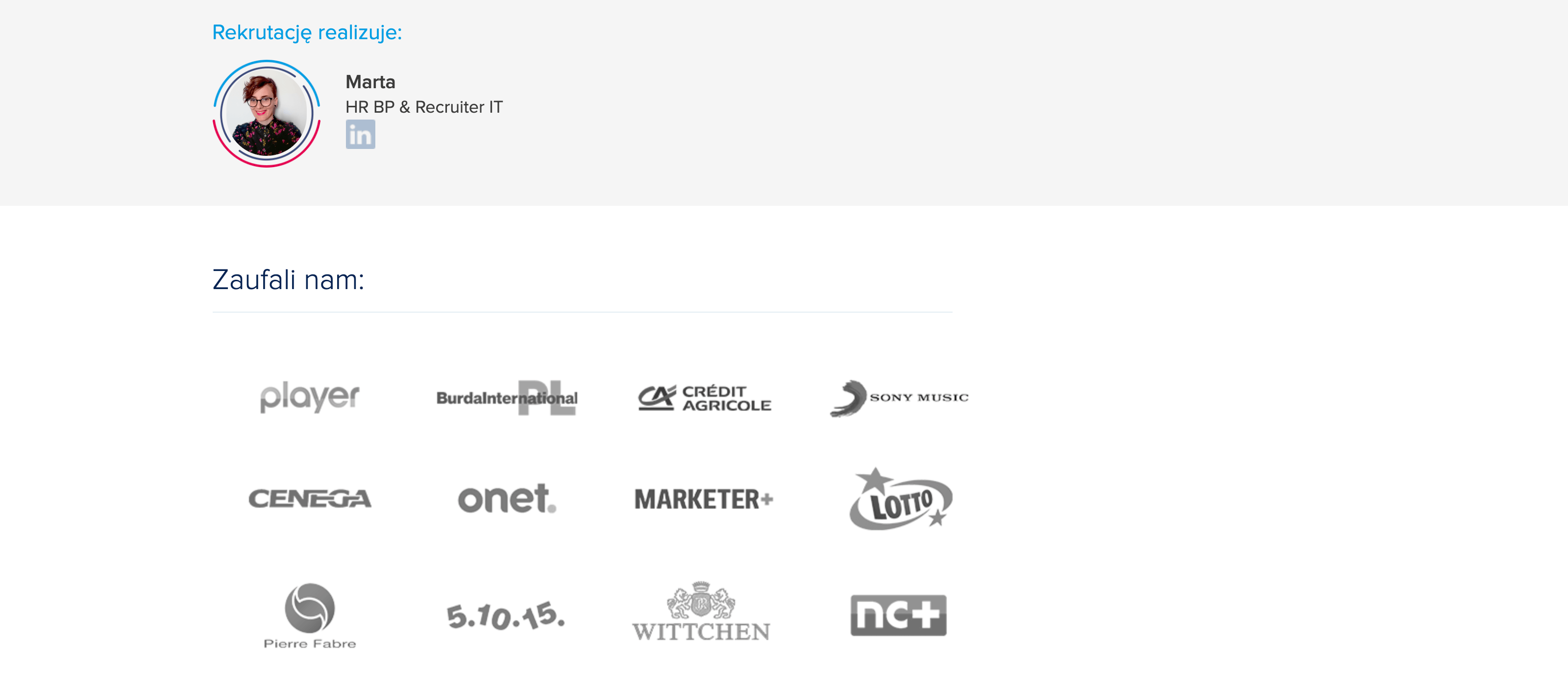 Niektóre elementy graficzne przygotowane z myślą landing page’u można wykorzystać również w ogłoszeniach zamieszczanych na portalach rekrutacyjnych – dzięki temu zachowamy spójność wizualną:
