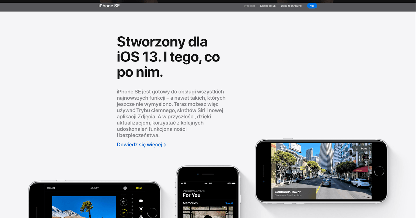 Animowana, nowoczesna i estetyczna strona docelowa z prezentacją nowego iPhone’a SE nie dość, że mierzy się z zarzutami stawianymi marce (“produkty Apple są drogie” lub “za rok będę musiała kupić nowy model, bo ten się zestarzeje”), to prezentuje korzyści w atrakcyjny i zrozumiały dla użytkownika sposób.