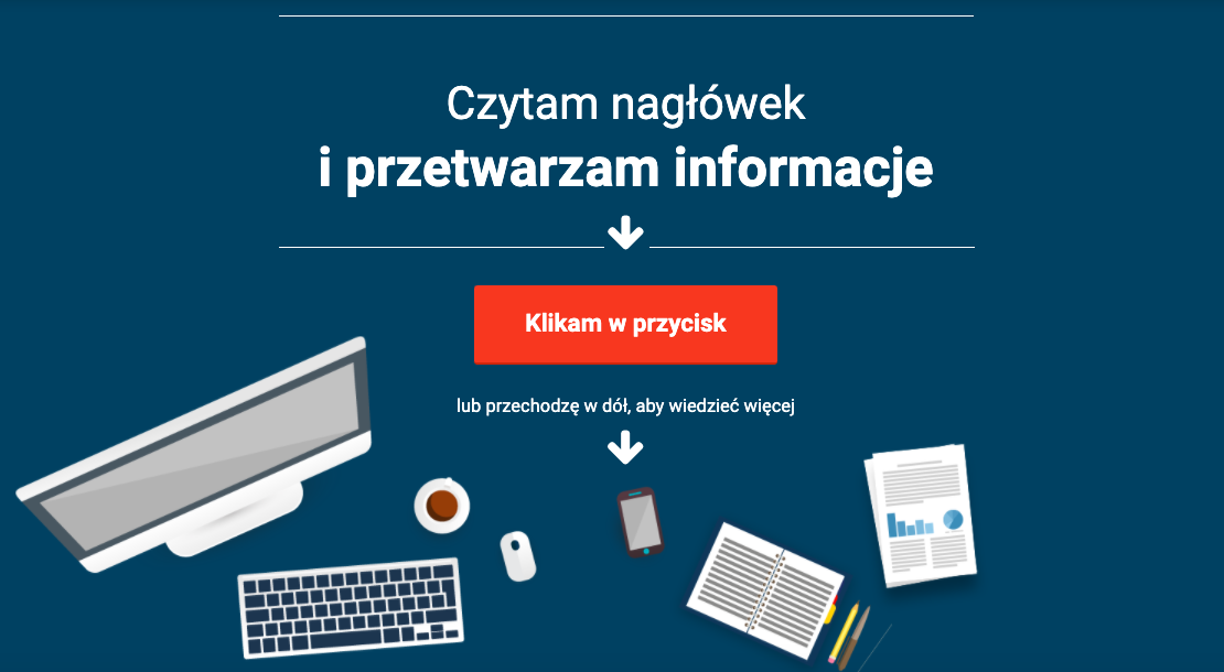 Pierwsze dwie zasady warto zastosować już na samym początku landing page’a. Nagłówek oraz przycisk CTA powinny znaleźć się nad linią zgięcia (obszarem, który widać na ekranie przed przewinięciem w dół), a pozostałe sekcje – poniżej. Dla odwiedzającego stronę tworzy to bardzo konkretną ścieżkę: