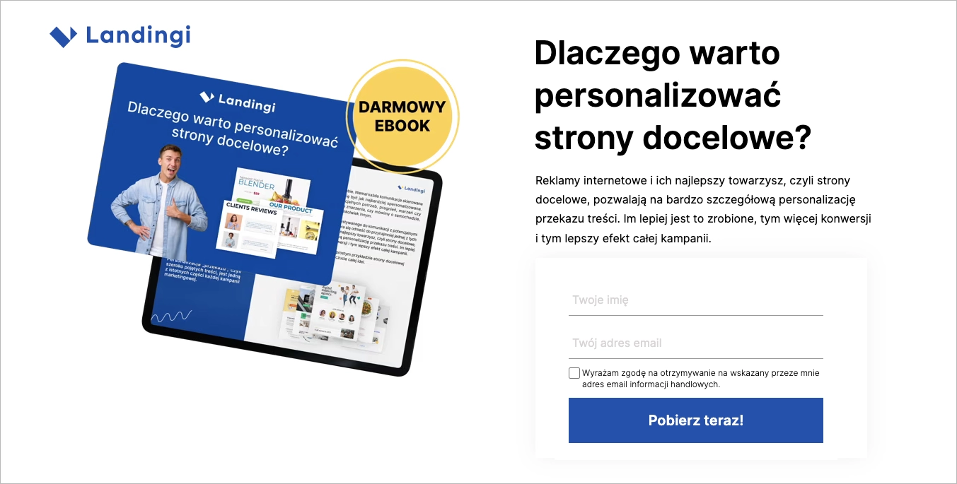 - Pojedynczy formularz opt-in – otrzymanie ebooka nie może być prostsze.