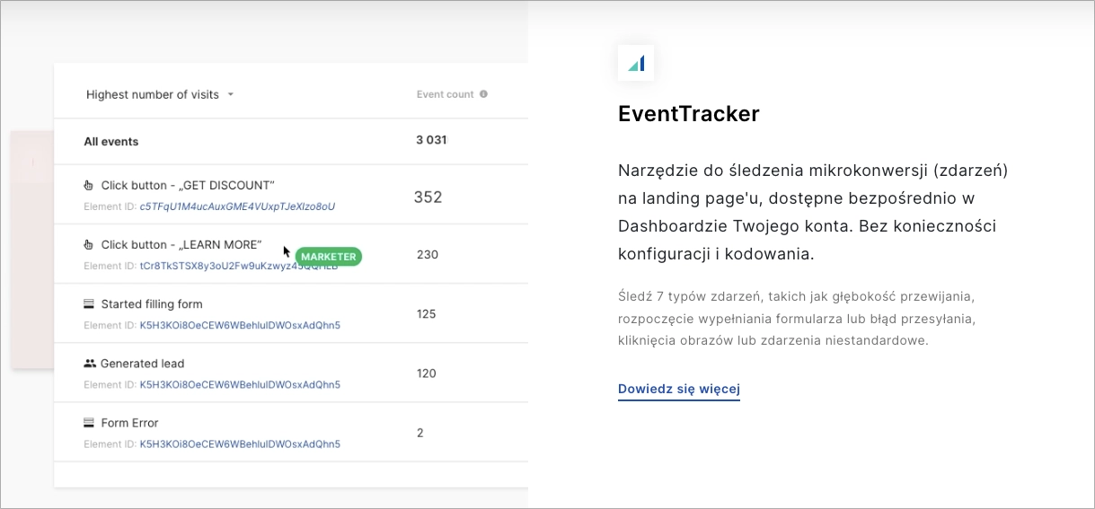 Możesz także wybrać uniwersalną platformę, taką jak Landingi z wbudowanym EventTrackerem, aby śledzić rzeczywiste dane na temat mikrokonwersji. Dzięki temu poznasz potencjał swojej strony i uzyskasz wgląd w obszary wymagające poprawy.