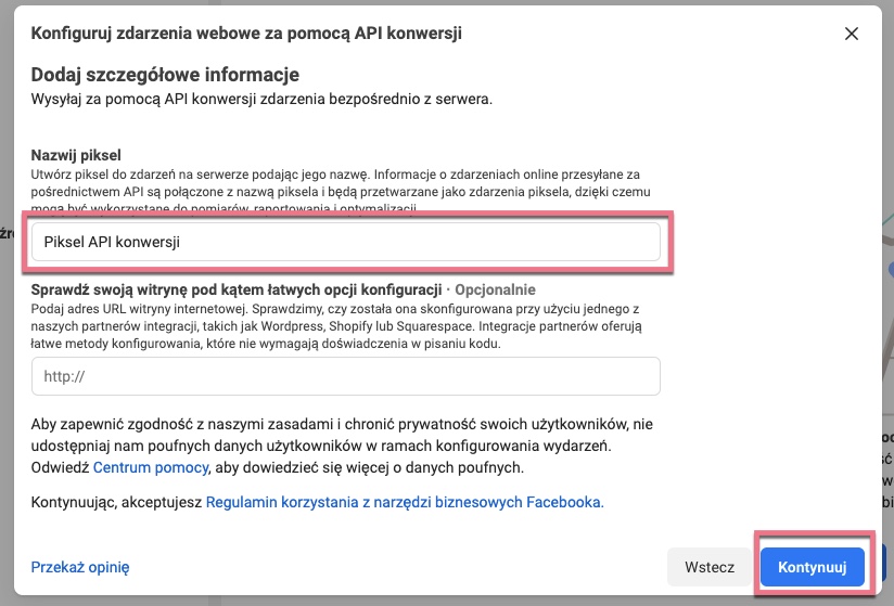5. Nazwij swój piksel. Opcjonalnie możesz wprowadzić adres URL witryny, aby sprawdzić opcje łatwej konfiguracji. Następnie kliknij Kontynuuj, by utworzyć piksel.