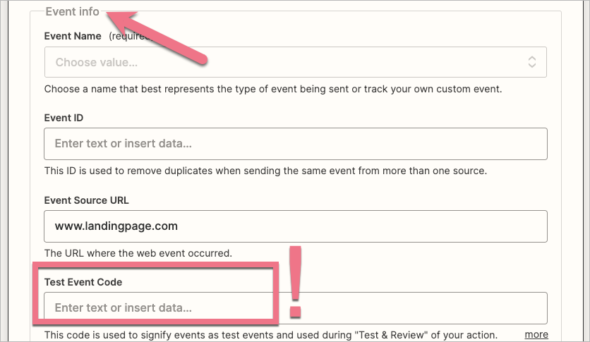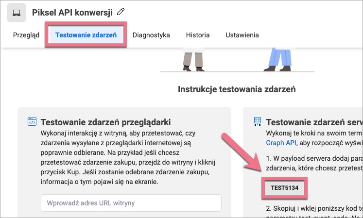 12. W kolejnym wierszu, Test Event Code, wklej klucz testowania zdarzenia z Facebooka. W tym celu ponownie przejdź do Menedżera zdarzeń. W zakładce Źródła danych znajdź swój piksel i kliknij w Testowanie zdarzeń. Skopiuj klucz testowy i wklej go w odpowiednim miejscu w Zapierze.