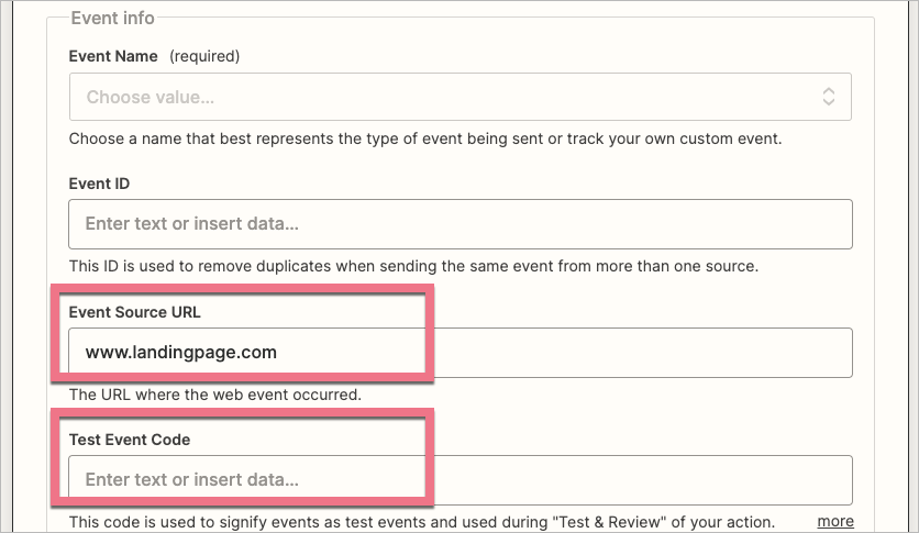 W polu Event Source URL wklej adres Twojego landing page’a.