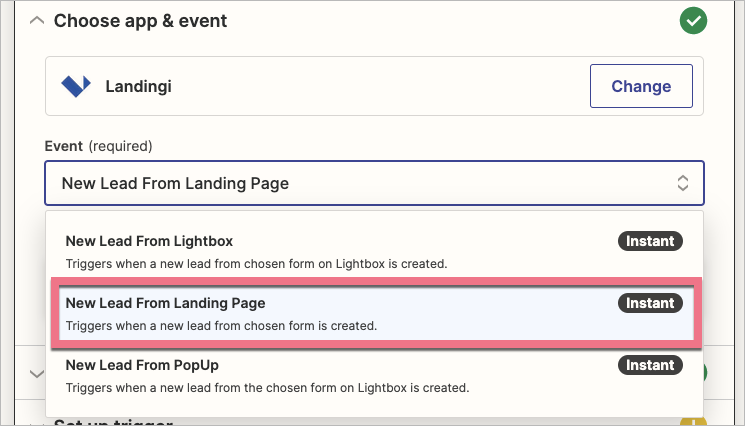 4. Z rozwijanej listy wybierz rodzaj triggera – New Lead From Landing Page, następnie kliknij Continue.
