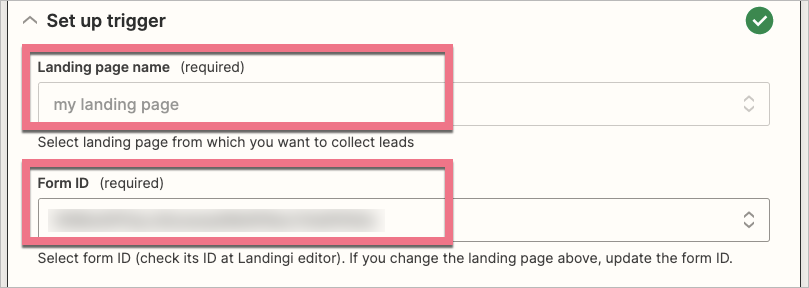 6. Wybierz landing page oraz ID formularza. Na liście znajdziesz tylko opublikowane landing page’e oraz formularze, które są umieszczone na zwykłej sekcji.