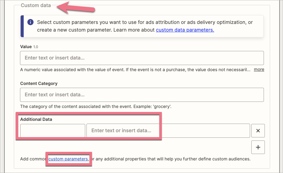 13. Jeżeli chcesz śledzić zdarzenie zakupu (Purchase), w sekcji Custom data > Addtional Data na samym dole wpisz odpowiednie wartości. Kliknij w custom parameters i sprawdź, jak poprawnie wypełnić te pola.