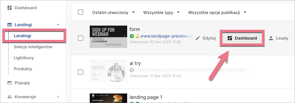 1. W panelu głównym platformy wejdź do zakładki Landingi i przejdź do Dashboardu landing page’a.