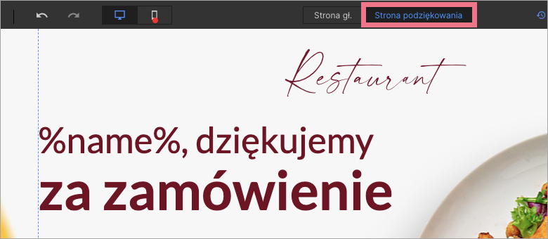 6. Teraz przejdź do edycji strony podziękowania. Umieść skopiowaną wcześniej Wartość atrybutu name pola (w tym przypadku name) w dowolnym miejscu w tekście, gdzie chcesz spersonalizować komunikat. Musi on być poprzedzony i zakończony znakiem %, np. %name%.