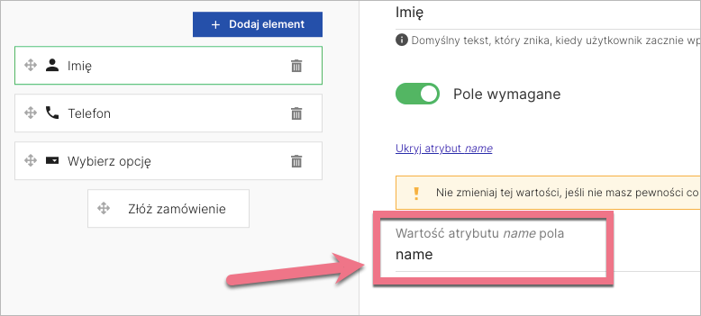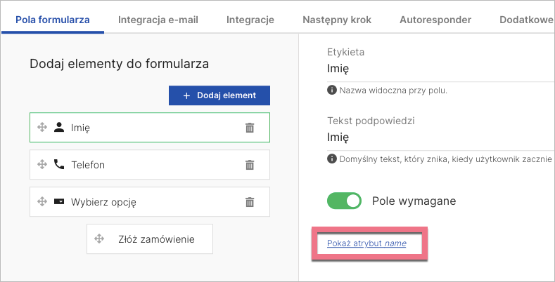 4. W zakładce Pola formularza wybierz lub dodaj element, którego dane chcesz wyświetlać na stronie po konwersji, np. Imię. Kliknij Pokaż atrybut name.