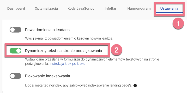 2. Przejdź do Ustawień (1) i włącz Dynamiczny tekst na stronie podziękowania (2).