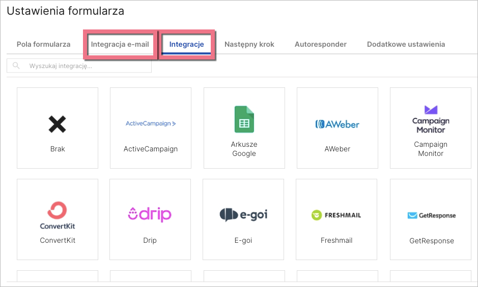 2. Skonfiguruj integrację e-mail i/lub jedną z integracji z systemem zewnętrznym.