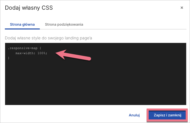Aby Twoja mapa była responsywna i dostosowywała się wielkością do ekranu także na urządzeniach mobilnych, musisz zmienić kod HTML mapy i dodać własny CSS do landing page’a.
