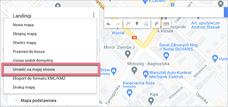 6. W lewym górnym rogu pojawi się podana przez Ciebie nazwa mapy. Obok kliknij w ikonę trzech kropek i z listy rozwijanej wybierz Umieść na mojej stronie. Skopiuj kod HTML, który pojawi się w wyskakującym oknie.