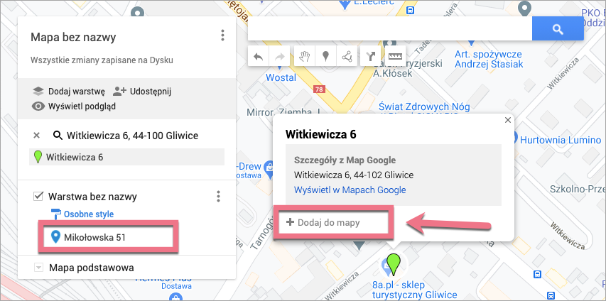 3. Gdy zostanie wyszukana, kliknij w wyskakującym oknie Dodaj do mapy, po czy analogicznie wpisz kolejne lokalizacje (dodane lokalizacje będą pojawiać się w oknie po lewej).