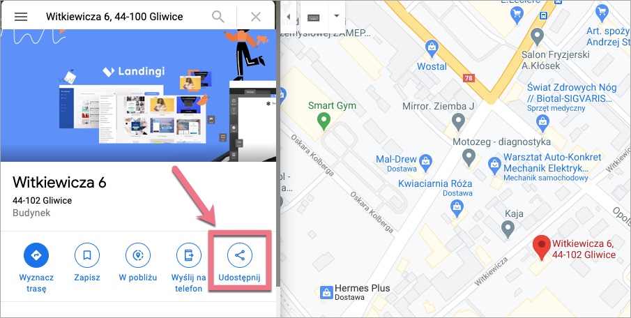 1. Wyszukaj adres na mapie Google. Kliknij przycisk Udostępnij.