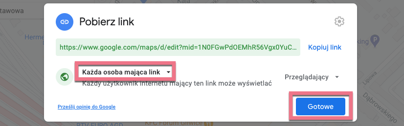 5. Oznacz mapę jako publiczną w Internecie. Zmień sposób udostępniania na Każda osoba mająca link i zapisz, klikając Gotowe.