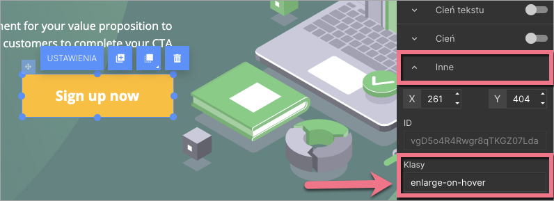 2. W edytorze zaznacz widget, który chcesz powiększyć. W toolbarze po prawej stronie odszukaj zakładkę Inne i wpisz enlarge-on-hover w polu Klasy.