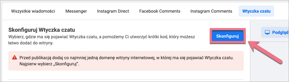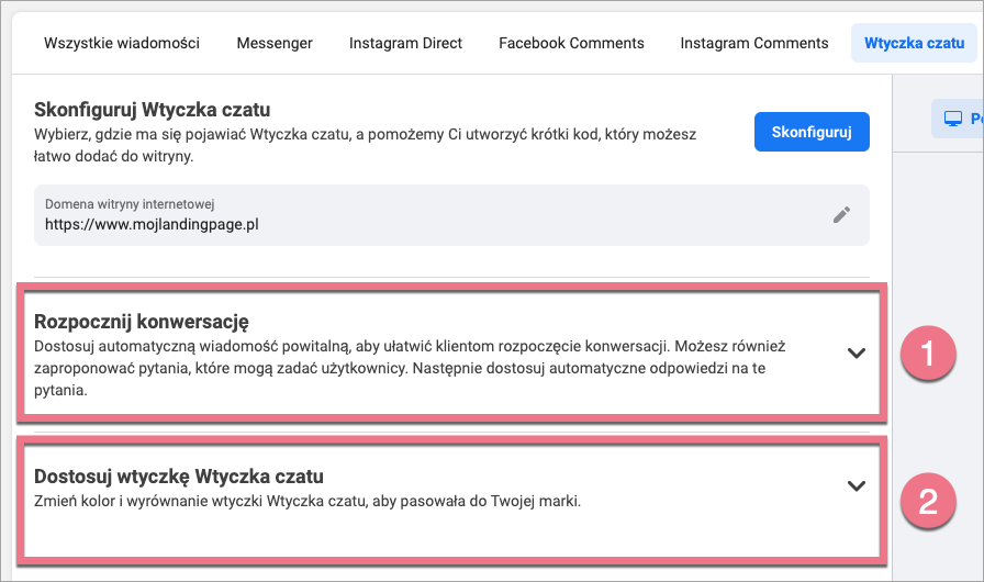 1. W ustawieniach konta firmowego przejdź ponownie do zakładki Dodaj Messengera do swojej witryny.