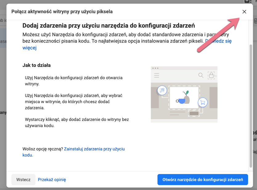 W platformie Landingi zdarzenia instaluje się ręcznie za pomocą kodu. Jeśli po raz pierwszy konfigurujesz ustawienia piksela Facebooka, możesz zamknąć kolejne okno.