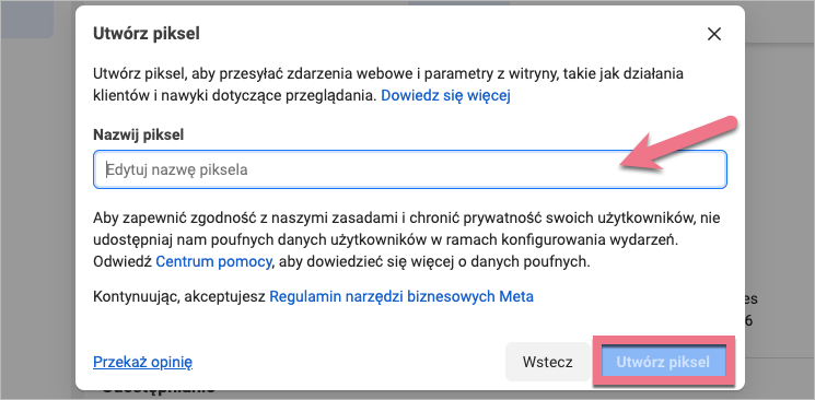 4. Nazwij piksel i kliknij Utwórz piksel.